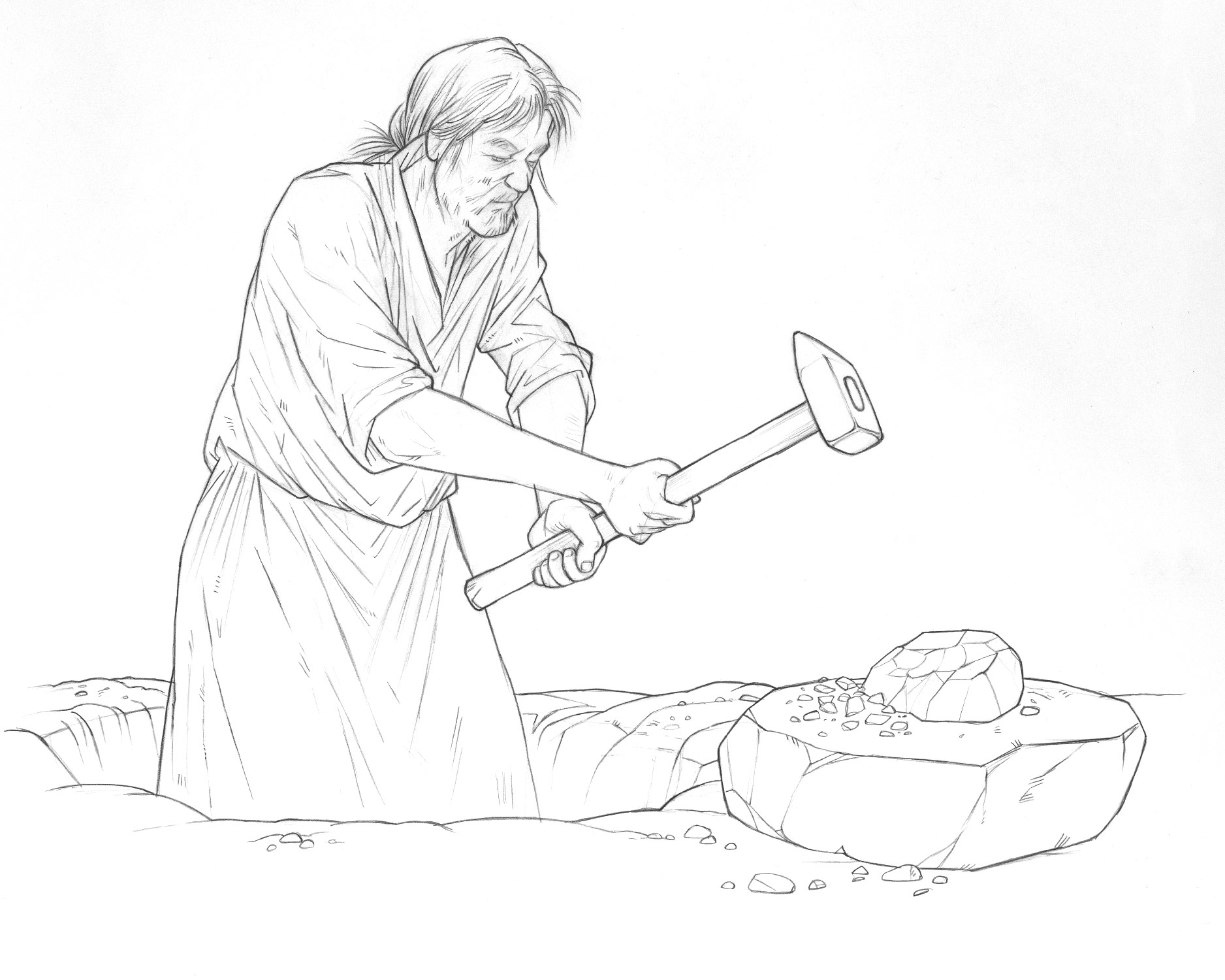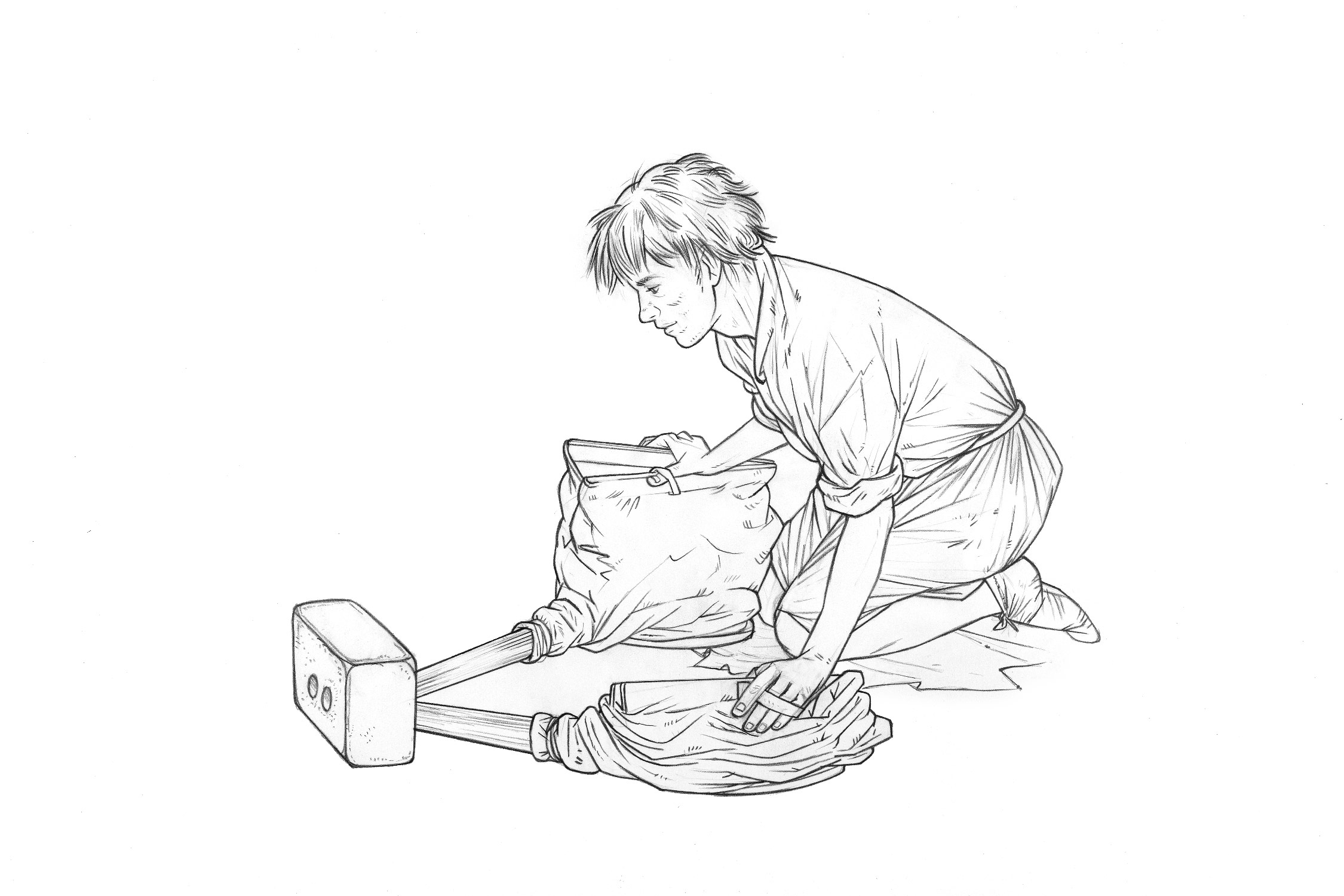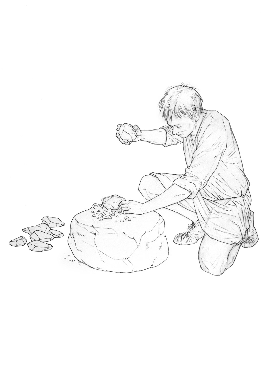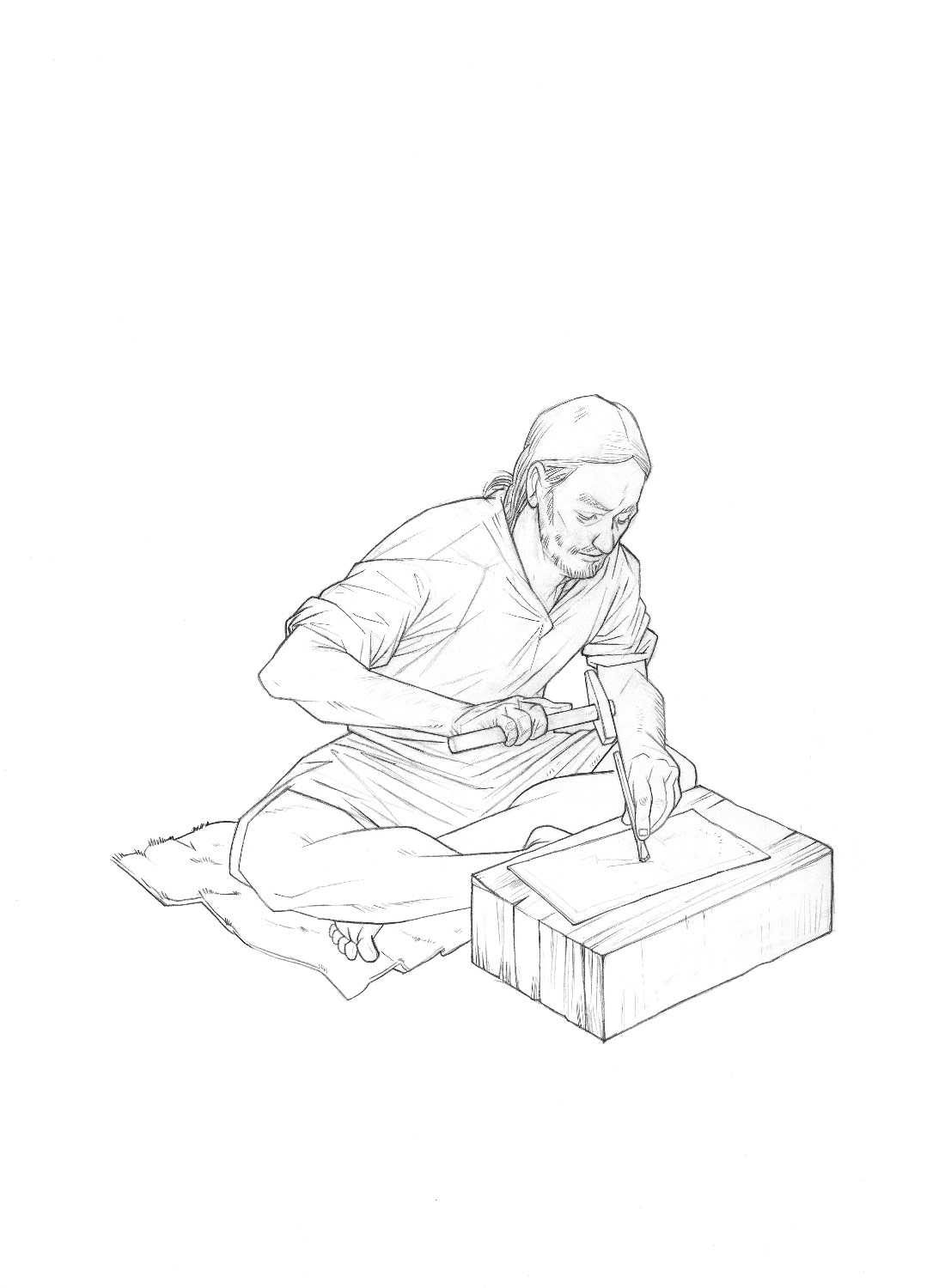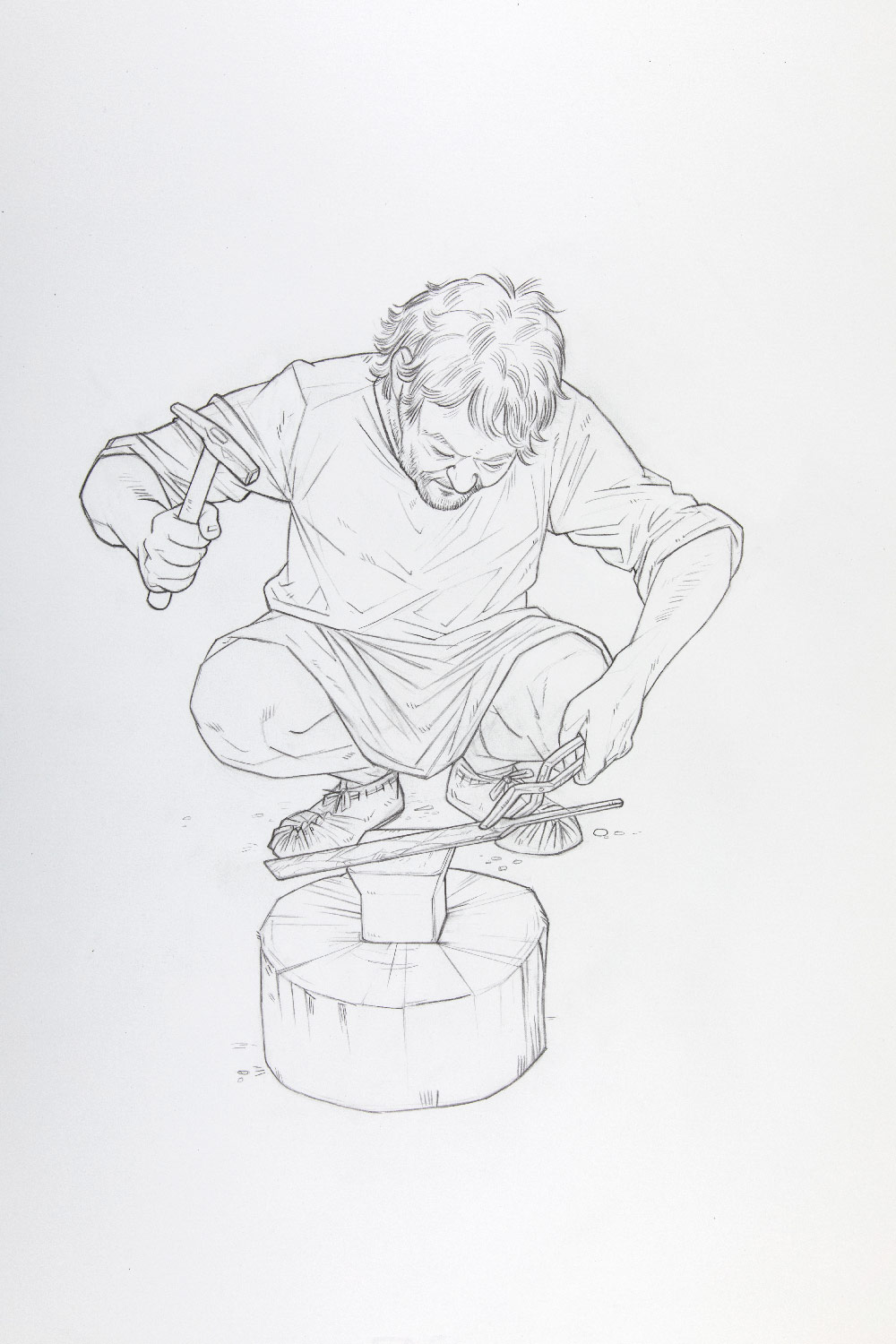 IT: Serie di illustrazioni raffiguranti utensili e il processo di estrazione e lavorazione del ferro in una fucina celtica. Disegni originali 56 cm x 76 cm, matita su carta, 2021