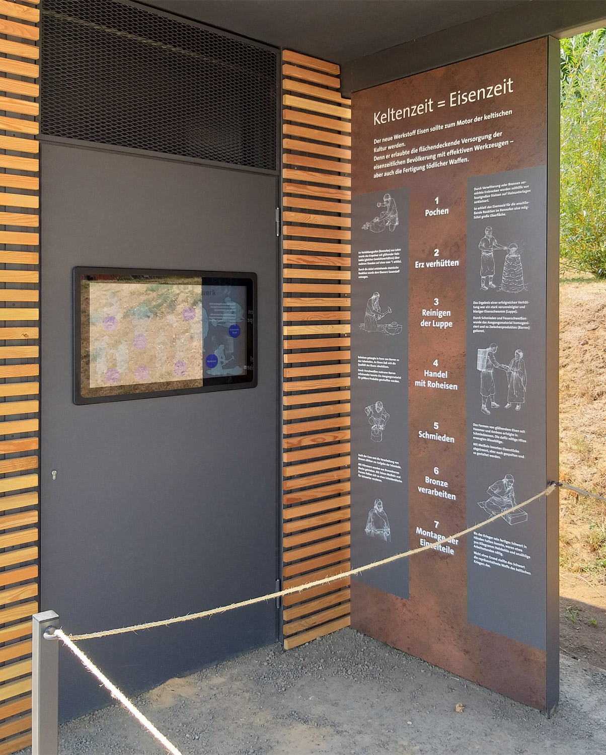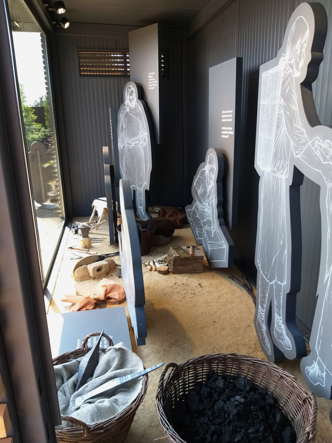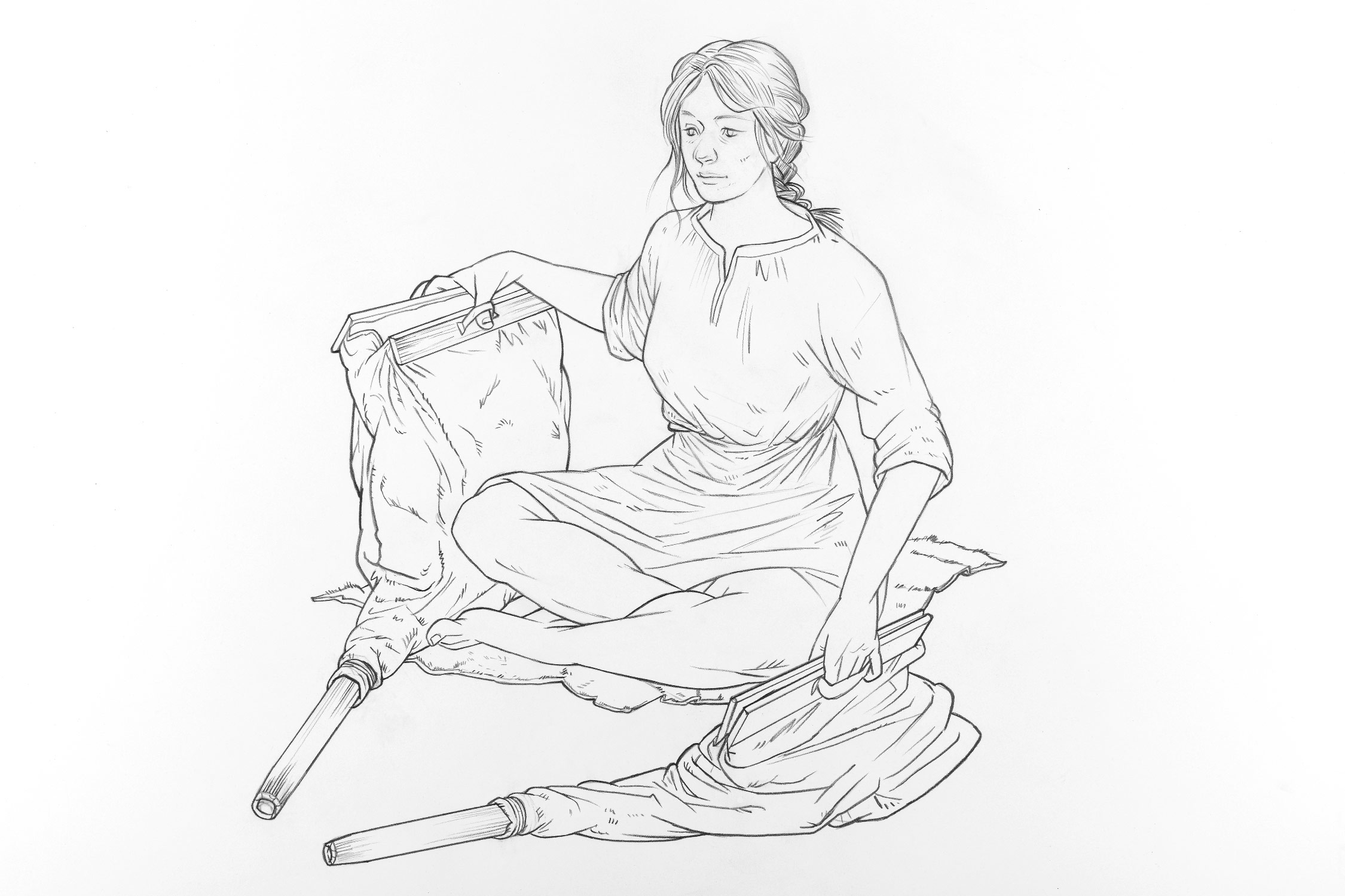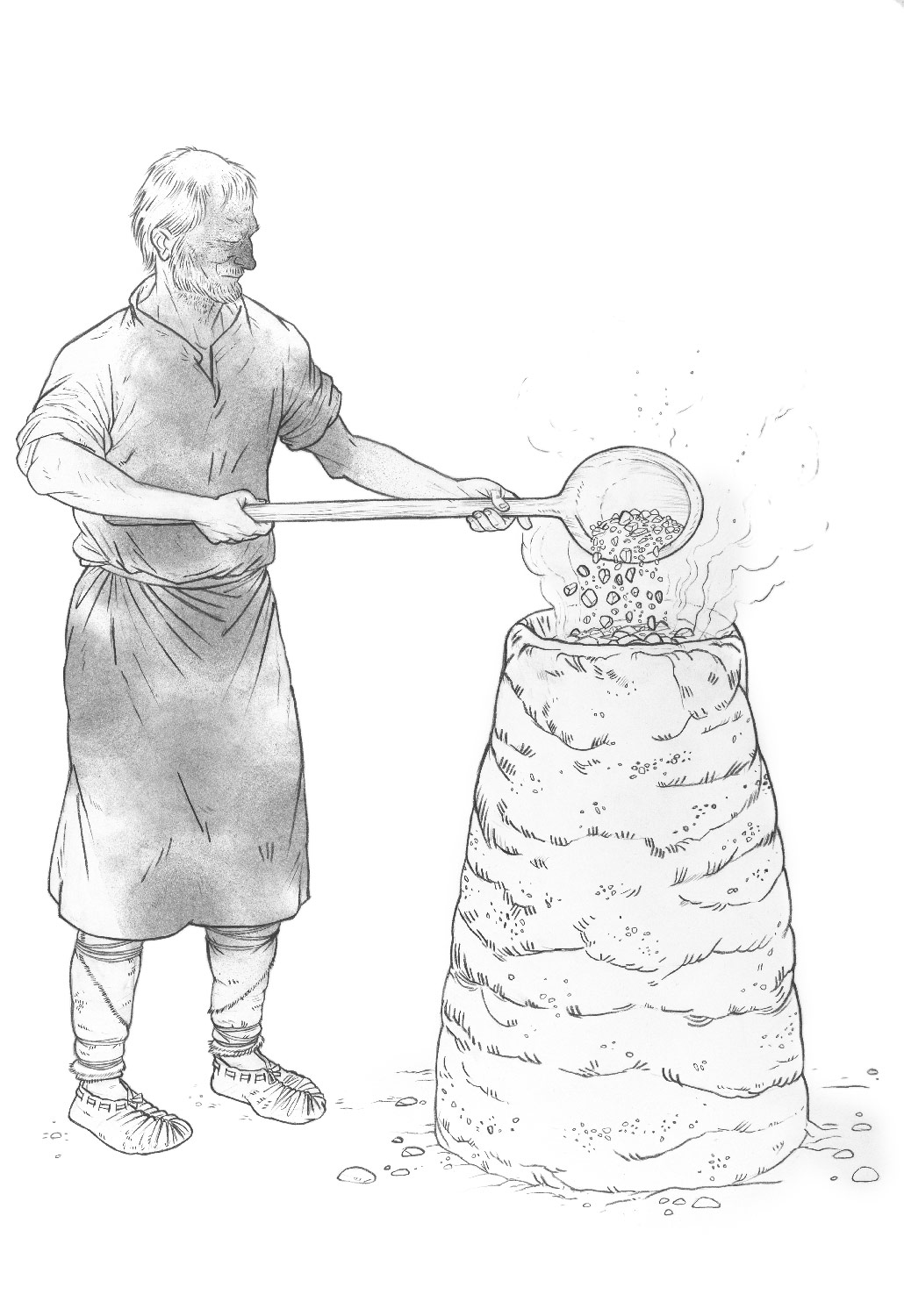 DE: Serie von Illustrationen, die Werkzeuge und den Prozess der Gewinnung und Bearbeitung von Eisen in einer keltischen Schmiede darstellen. Originalzeichnungen 56 cm x 76 cm, Bleistift auf Papier, 2021
