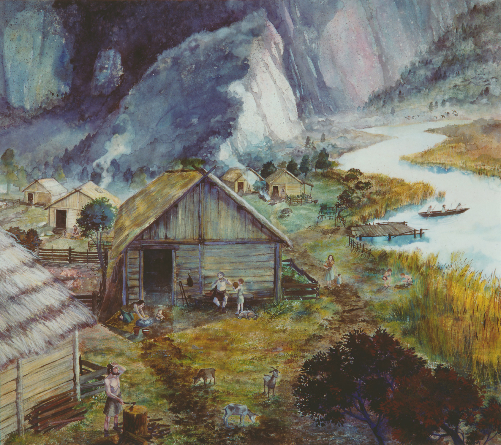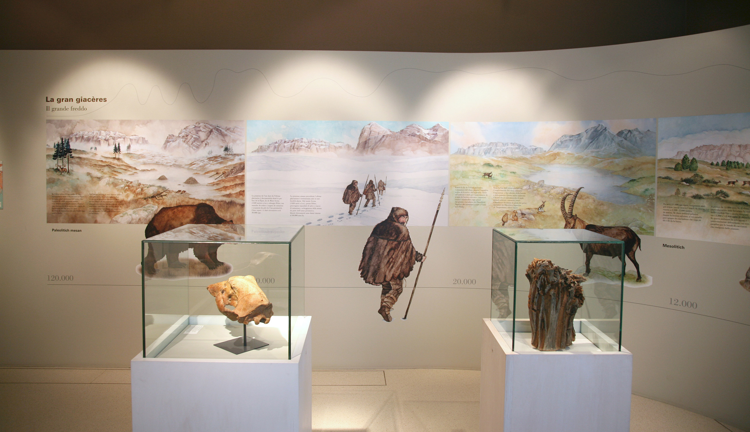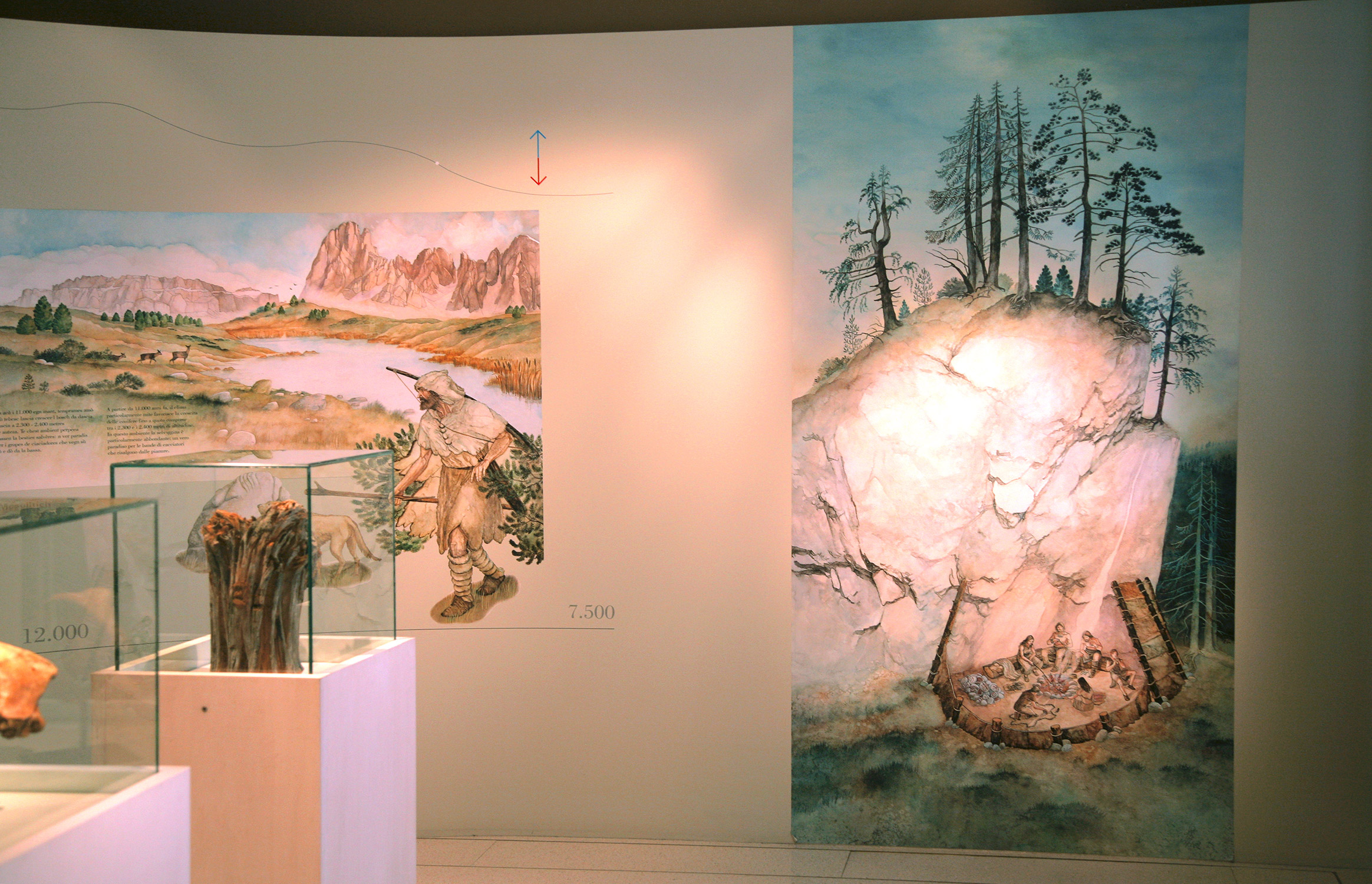 Hinweis: Der abgebildete Hund ist historisch nicht korrekt: Hunde in der Art von Jagdhunden kommen erst ab dem Mittelalter vor; es war eine Hommage an meinen damaligen Hund Matisse. Aquarell und Tempera auf Papier ca. 100 cm x 80 cm, 2002 - Museo Ladino di Fassa.