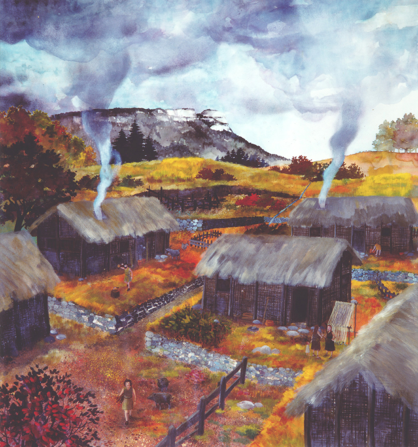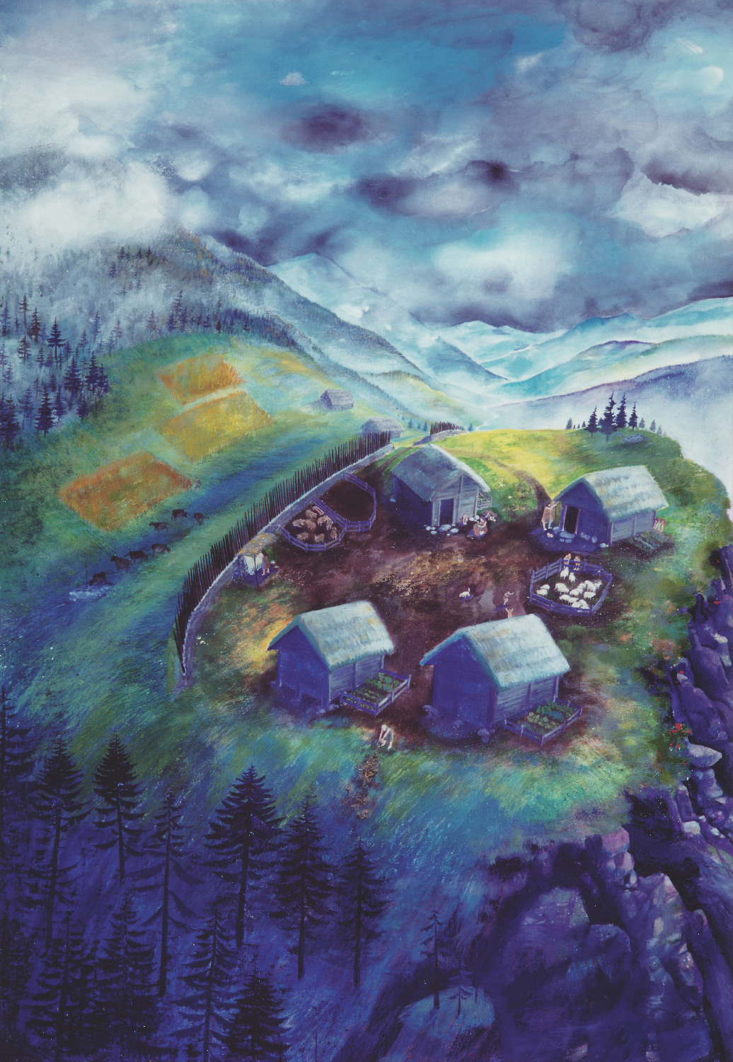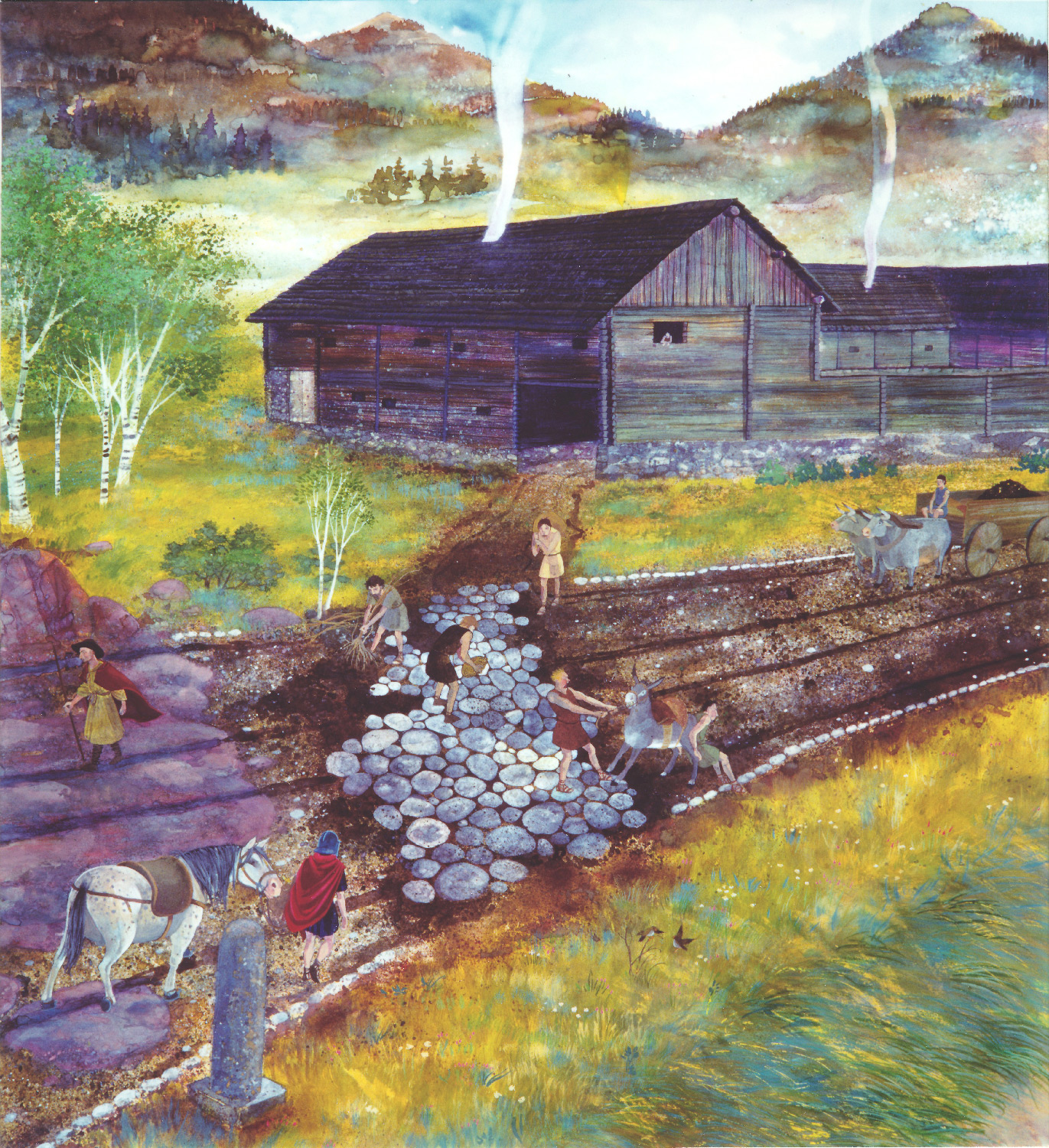 Hinweis: Der abgebildete Hund ist historisch nicht korrekt: Hunde in der Art von Jagdhunden kommen erst ab dem Mittelalter vor; es war eine Hommage an meinen damaligen Hund Matisse. Aquarell und Tempera auf Papier ca. 100 cm x 80 cm, 2002 - Museo Ladino di Fassa.