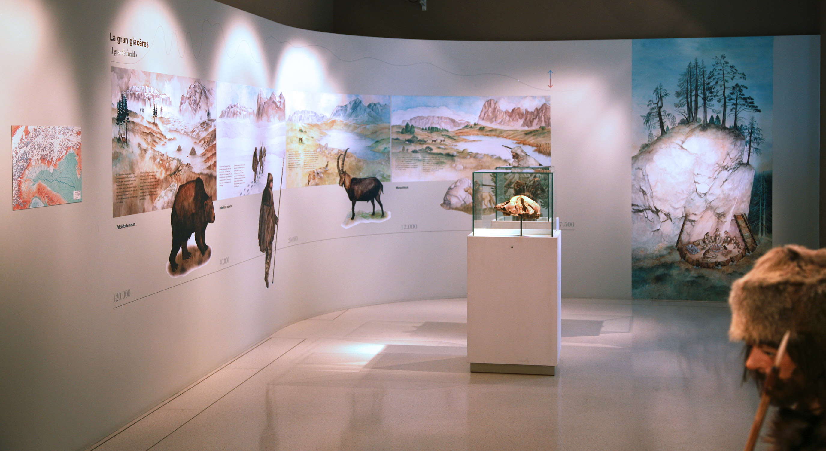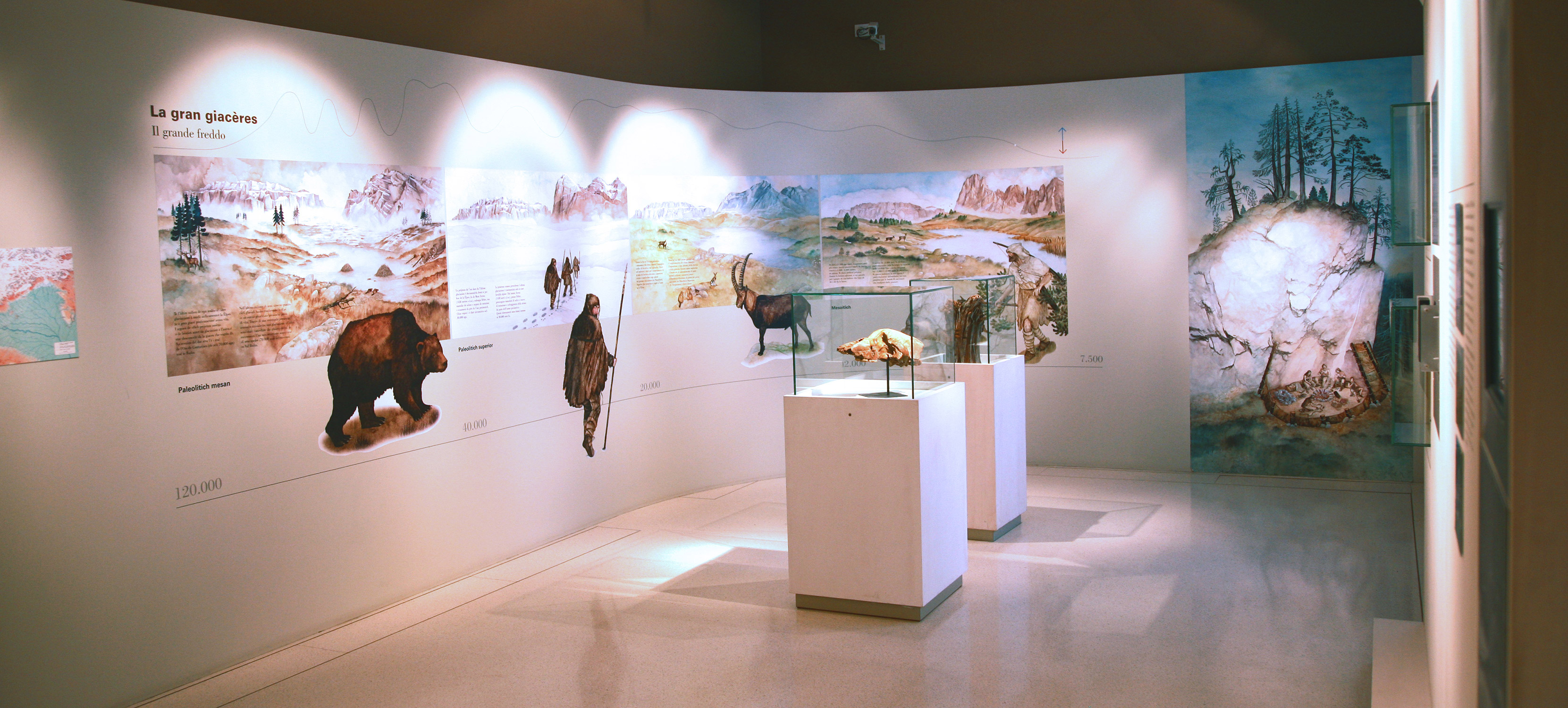IT: In una grotta sul Piz Cunturines in Val Badia, sono stati ritrovati resti di ossa dell’Ursus Ladinicus, vissuto tra 60.000 e 30.000 anni fa. Sullo sfondo a sinistra si riconosce il massiccio del Sella, simbolo delle valli ladine (Dolomiti), che da esso dipartono a raggiera. Per accentuare questo punto di convergenza e di riferimento geografico nei quattro diorami, ho scelto di mostrare il Massiccio del Sella sempre dallo stesso lato. Acquarello e tempera su carta 100 cm x 80 cm circa, 2002 - Museo Ladino di Fassa.