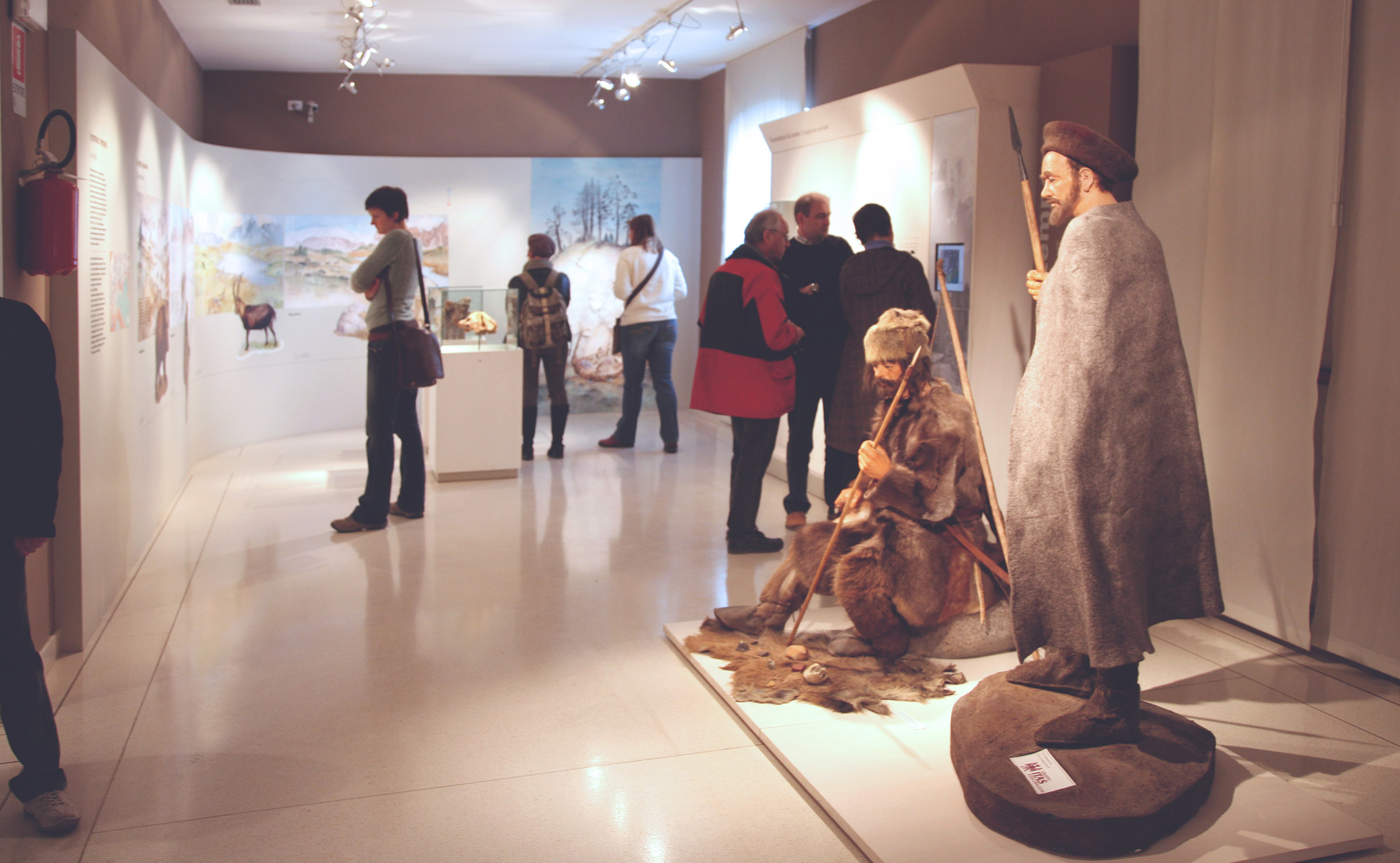 EN: Mesolithic. During the summer months, the first hunters settle in the Ladin valleys. In the background, the Saslonch group, the iconic symbol of Val Gardena, looms up.
