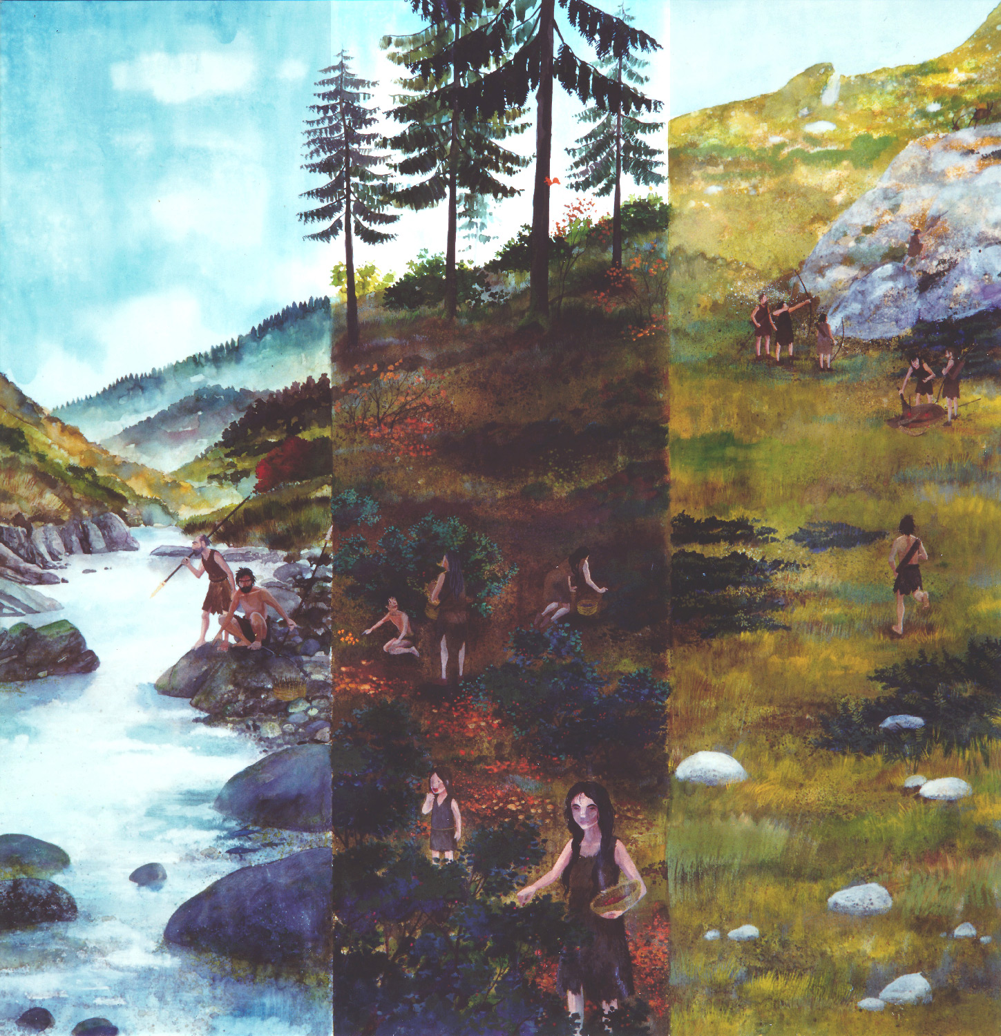 IT: Mesolitico. Durante il periodo estivo, i primi cacciatori si insediano nelle valli ladine. Sullo sfondo, oltre al Massiccio del Sella, si profila il Gruppo del Sassolungo, iconico simbolo della Val Gardena.